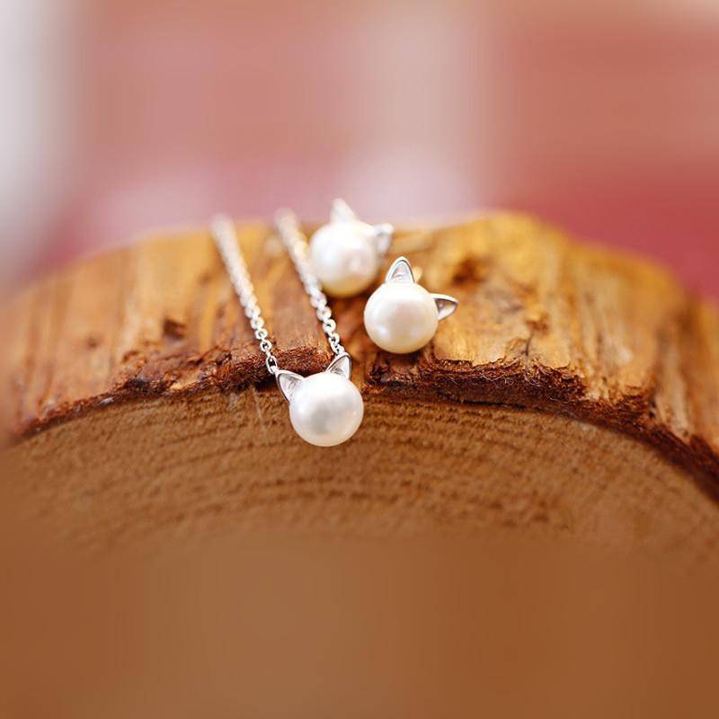 Hermoso Collar de Gato de Perlas con Pendientes + Anillo de Regalo